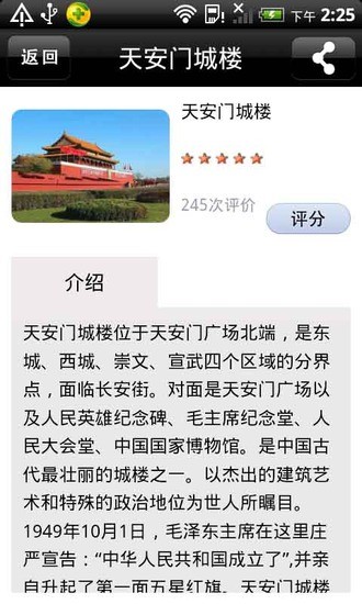 天安门广场是您首次北京旅行的必去之地,我们通过此手机导游程序,提供了精美的可缩放的天安门广场及周边地图,10多处景点的详细介绍展现了广场及其周边的建筑、文化、历史、旅游攻略等方方面面,定位,程序内拍照以及以及一键微博分享等功能,除定位及微博分享外,均可离线使用
