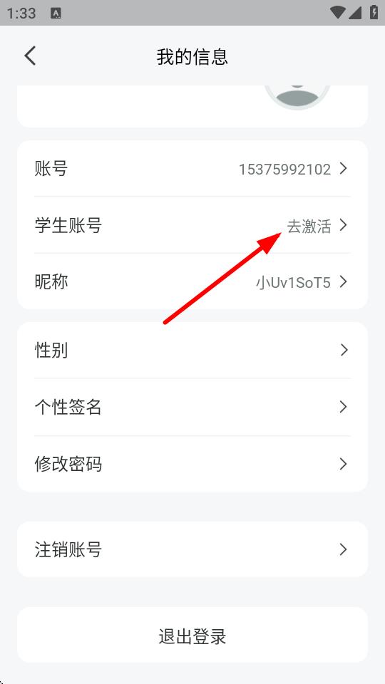 3、在我的信息页面中,找到学生账号选项,点击右侧的去激活按钮。