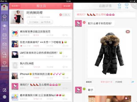 1.加入各种辣妈帮:比如根据宝宝现在的年龄,加入各种不同的宝宝年龄辣妈帮;怀孕的辣妈也可以根据自己的孕期加入不同阶段的孕期辣妈帮;爱时尚的辣妈可以在时尚辣妈帮里讨论各种时尚、扮靓生活;在巧手DIY辣妈帮里,辣妈可以发现全国各地心灵手巧的辣妈,大家可一起分享交流自己的作品;在全国300多个同城辣妈帮里,辣妈们一定能发现自己身边的辣妈,一定有辣妈能帮助解决身边的问题;在宝宝营养,宝宝健康,宝宝教育,母应用品辣妈帮里,辣妈们一定能找到宝宝吃,穿,用,玩等方面问题的答案;在物品信息发布帮里,辣妈能看到辣妈们喜爱的物品,并且自己也能淘到满意的东东,最后还有最具人气的情感天空辣妈帮,这里没有婆婆,没有老公,辣妈们可以共同出谋划策来打击小三,来正确处理婆媳、夫妻之间遇到的各种问题。