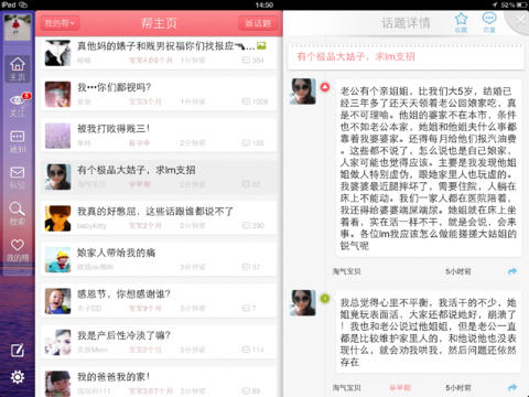 这里已经形成了一个热闹非凡的熟女的社区,辣妈帮的姐妹们来自大陆、港澳台、欧美等各地,大家畅所欲言,谈论育儿,时尚,扮靓,瘦身,情感,婆媳,打击小三,美食,购物,劲爆的自传连载,两性健康…… 来到这里不仅仅是学到丰富的孕育知识,更是一次熟女之间的心灵沟通之旅。在手机的方寸屏幕之间,随时随地陪伴你的是辣妈帮姐妹们温暖的感情和积极生活的正能量,它让你的内心更加自信而美好。很多辣妈在app store的评论里评论到:辣妈帮已经成为了我生活的一部分,在这里我认识了很多热情的辣妈,每天都会来刷下。我们相信你来了之后也会离不开了。:)