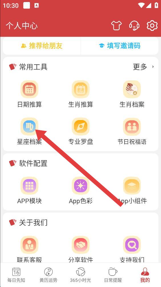 2、在个人中心下滑,找到常用工具板块,点击星座档案图标。