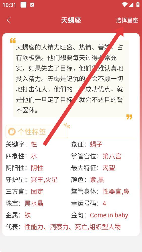 3、进入星座档案界面,点击界面右上角选择星座选项。