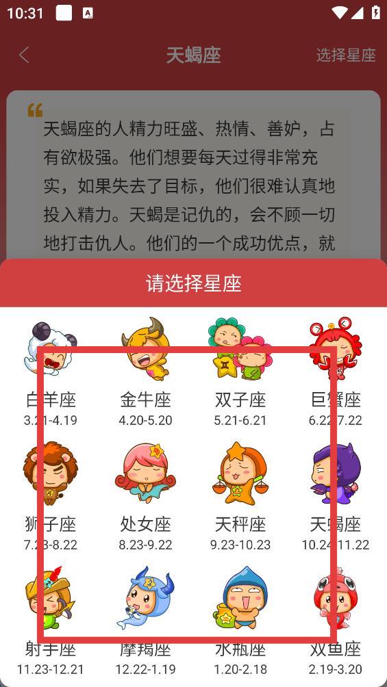 4、在弹出的界面,点击想要查看的星座图标,即可查看对应的详细信息。