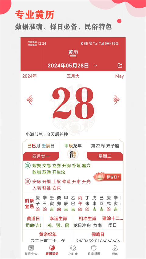 365小时光是一款功能丰富的日历软件,提供万年历、黄历、农历、节日节气、放假安排、宜忌查询等功能,200年准确黄历数据,支持离线使用,可实时显示天气动态、空气质量,提供24小时天气趋势、7日天气预报,具备吉日查询、生肖运势、星座运势、生辰排盘、主题定制等实用工具,有日视图、月视图、周视图等多种实用小组件,方便用户不用打开APP就能查看事件进度。