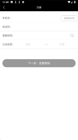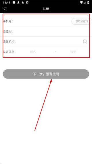 2、在注册页面,输入手机号,填入验证码,选择隶属机构,填写认证信息,点击下一步,设置密码。