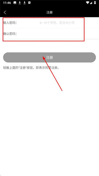 3、在设置密码页面,输入密码,再次确认密码后,点击注册,完成注册流程。