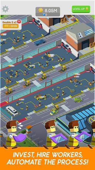 休闲造车大亨游戏的玩法设定还是挺有意思的,游戏中玩家需要作为一个流水线的老板,玩家需要将自己的汽车制造厂提升生产力,很轻松的一款游戏,很适合放松身心。