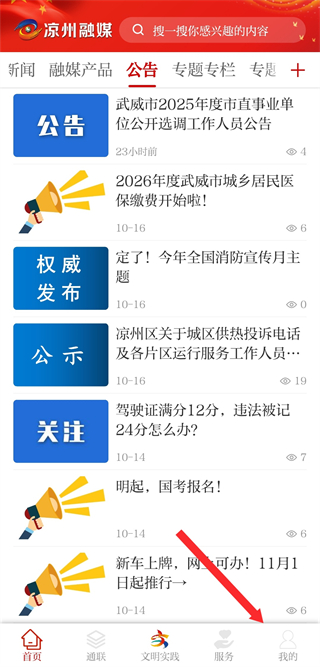 1、在凉州融媒首页,点击底部我的按钮,进入个人的页面。