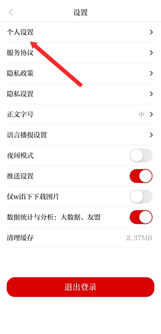 3、在设置的页面,需要点击个人设置,进入个人资料的页面。