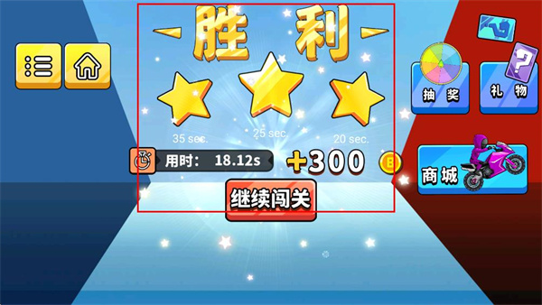 4、胜利后查看用时与奖励,点击继续闯关按钮进入下一个竞技关卡。