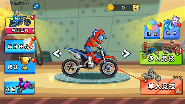 2、在主界面找到单人竞技选项并点击,进入摩托竞技的关卡挑战场景。