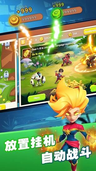 2、全程挂机——无需操作的放置类游戏!派出你的英雄战队,放置英雄,超级英雄将为你自动战斗!
