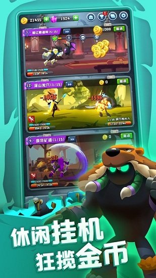 1、一款放置挂机的多英雄寻宝之旅,通过搭配英雄天赋技能和传说装备,征服一个个令人惊心动魄的章节。