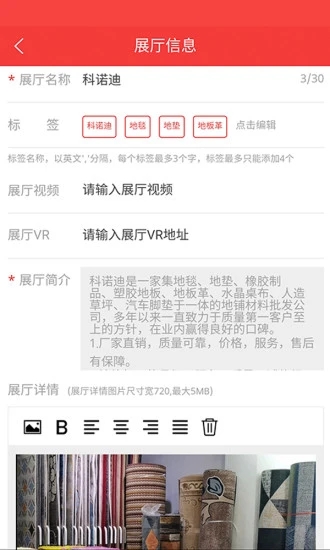 地毯汇商家版是一款专门为地面装饰材料商家打造的全新信息管理平台。为商家提供方便的展厅店铺管理、产品管理、智能数据统计分析等功能,可以在线查看产品分析数据、用户画像分析数据,可以在线参与行业活动、行业展会,为商家提供统筹精准营销、销售渠道拓展、线上线下资源融合、供应链金融等服务。