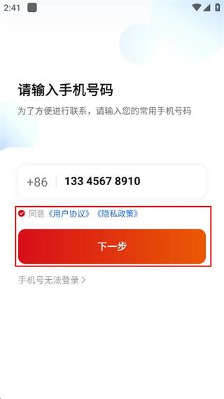 2、在请输入手机号码页面,填写常用手机号码,勾选同意相关协议。