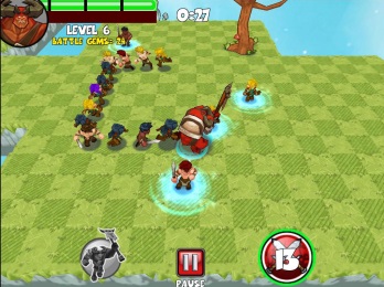 1.召集士兵:重按游戏屏幕并滑动能让英雄改变跑动的方向(只能左右),我们要做的就是不断的让英雄触碰到场上刷出的士兵,士兵就会跟在英雄后面跑,如果一段时间未触碰到,则会消失。有没有一种很熟悉的感觉?没错就是和贪吃蛇的玩法类似。