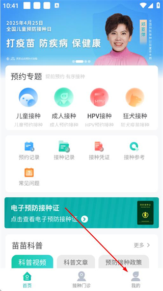 1、在粤苗App首页点击底部的接种门诊,进入接种门诊页面。