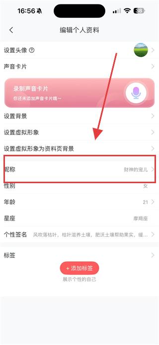 3、在编辑个人资料界面中点击昵称,进入昵称设置页面。