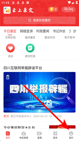 1、打开云上康定APP首页,点击底部我的,进入个人功能区域页面。