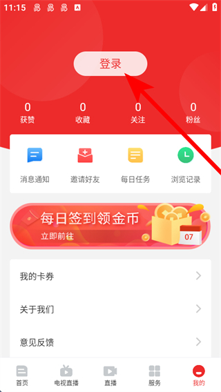 2、在个人功能区域页面,点击登录的入口,进入登录方式选择界面。