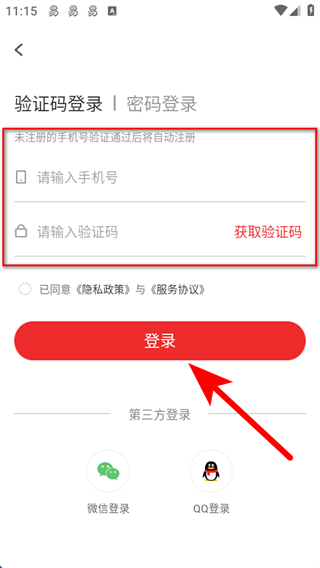 3、在界面选择验证码登录,未注册手机号将自动完成注册并登录。
