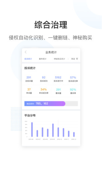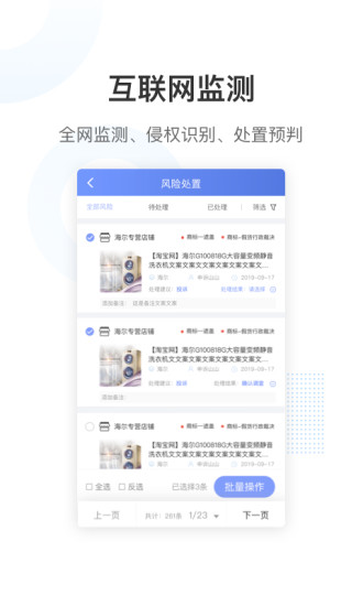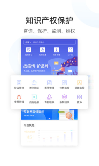 支持境内、境外主流电商平台的电商数据监测;支持全球域名监测;支持全网舆情数据的监测;支持商标、专利、著作权等支持产权数据的监测;且利用自主研发的图片/视频识别技术、语义识别技术、侵权假货模型实现侵权识别,侵权等级评估,侵权处置预判