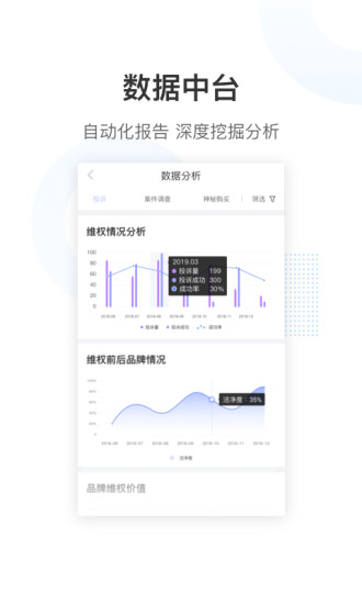 由自主研发的侵权算法模型、假货算法模型等几十种大数据算法模型,以及历史积累的风险数据库搭建而成的数据中台,帮助用户深度分析挖掘数据更深层次的价值,为用户提供更多的案件线索、趋势预览,辅助决策