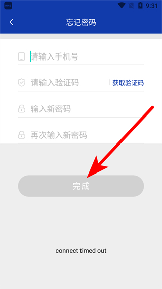 4、填写手机号、验证码及新密码后点击完成,完成密码找回操作。