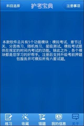 软件包含有历年真题、考前冲刺、模拟考场等学习模块助于您巩固知识,错题重做、我的收藏便于您查缺补漏,考试宝典手机软件随时随地为你的考试护航。丢掉书本玩手机照样考过护士资格,走着站着躺着座着随时随地模拟练习,考试有招啊!