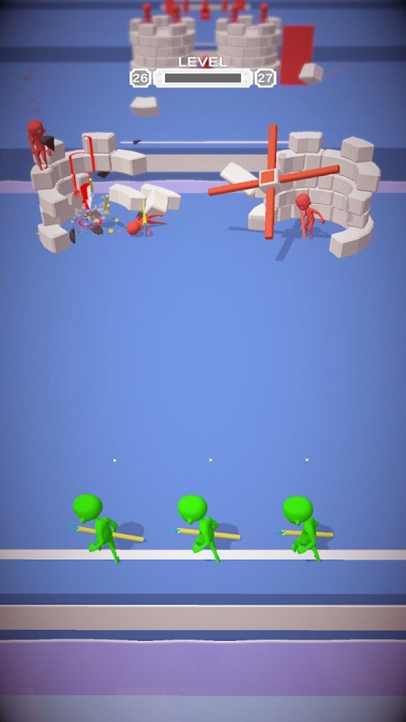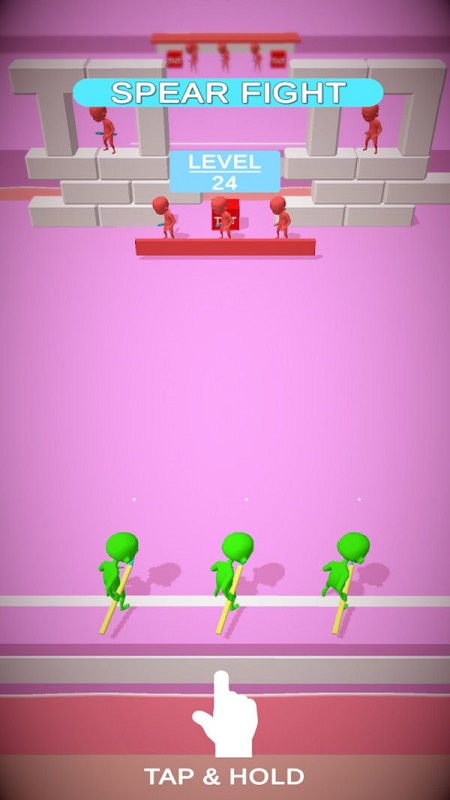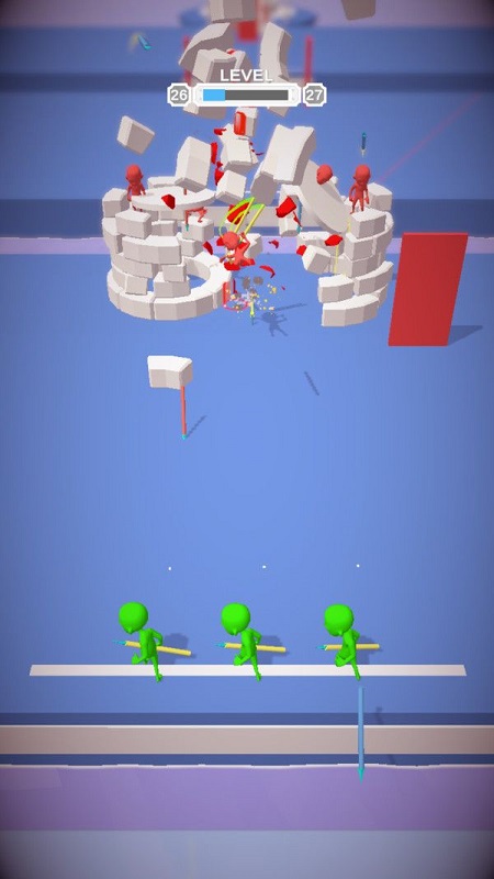 疯狂矛战的画面有强烈的3D立体感,背景的画面色调大部分是红色或者蓝色的,里面的方块是白色的,数量很多,可以拼装成很多其他的造型。里面的人物造型非常的简单,身体的构造线条很少,使用的工具就是长矛,这些长矛的头子没有锋利的武器,主要是根空空的棍子,使用这些工具攻击射击前面的敌人。