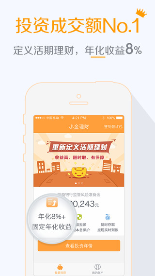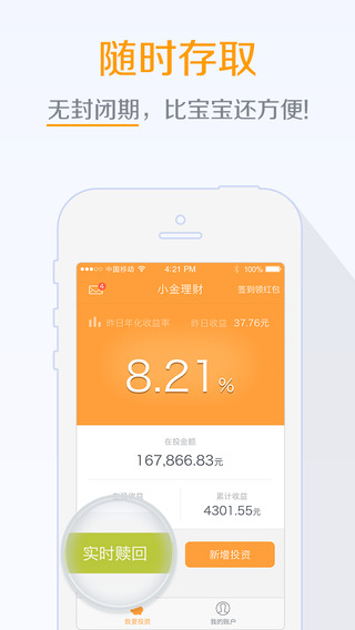 小金理财iOS版是一款投资理财服务的手机应用软件,可以帮助用户更好的管理自己的资金,让用户的资金有更好的选择推荐,软件的最大特点是可以活期理财,利用互联网信息技术,使个人用户能通过简单的注册、充值之后就可以直接购买理财产品,进行在线投资,获得一定收益,但是其实质是网贷,仍然有风险。方便实用的一款手机理财软件,需要的朋友不要错过哦!