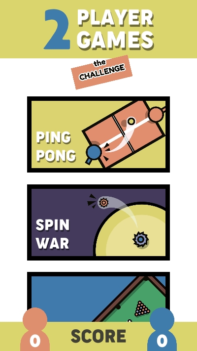 两个人的挑战是一款非常有趣的休闲益智手游。这款游戏非常适合两个人一起游玩,游戏画面风格很简单很容易上手,内置兵乓、微调战争、曲棍球、蛇、撞球、井字棋等多个小游戏,游戏非常有趣。你可以和朋友们一起打发时间、培养默契,非常适合两个人一起游玩。喜欢这类手游的玩家快来下载吧。
