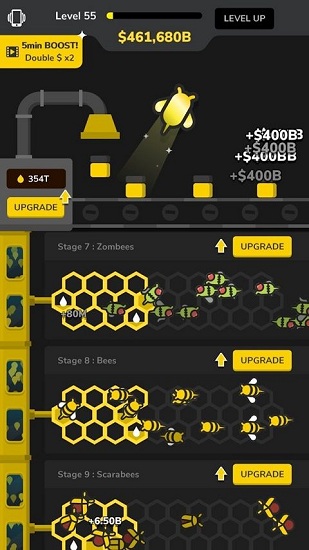 勤劳的工蜂外出采蜜,回来上交到蜂巢中,经由生产装置装罐卖钱。其实这是一款点击放置游戏(几乎没有策略深度)。