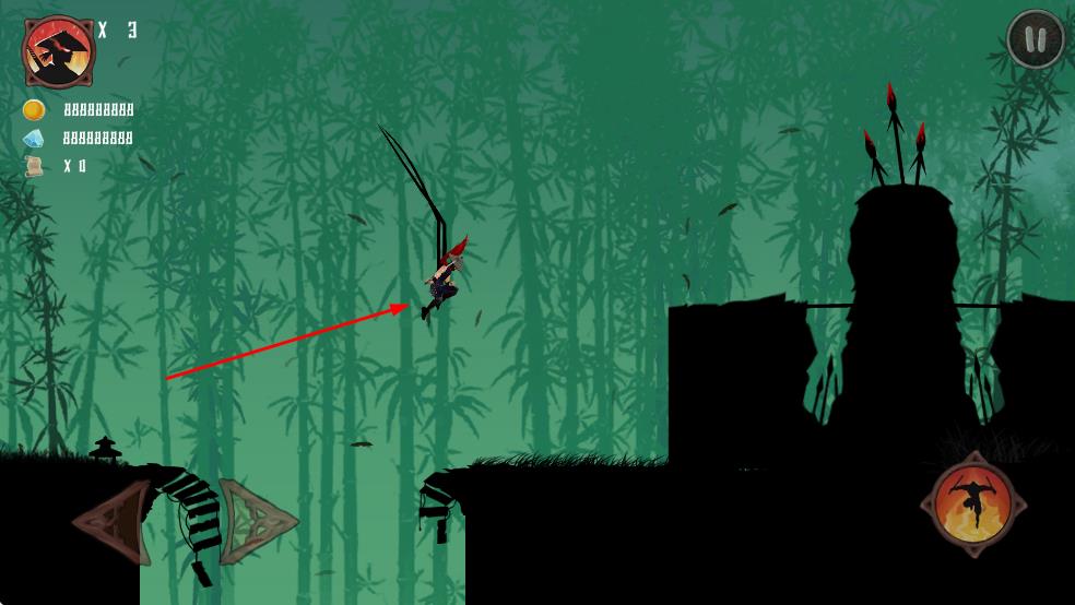 2、在竹林场景,操控忍者跳跃跨越障碍,利用画面按键让忍者移动、施展动作。