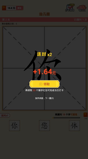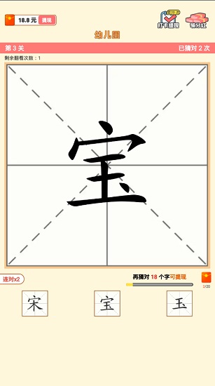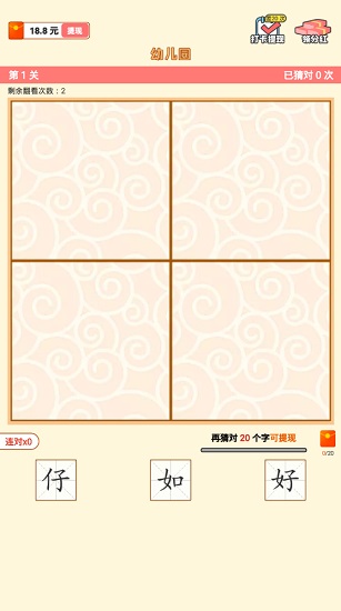 猜字达人游戏红包版玩法非常的有趣,每一关卡都会出现四个格子区域,下面会有三个备选答案,玩家可以点击任意区域来翻开,就会出现该字的一部分,根据提示猜出正确的字即可获得红包奖励,支持提现哦,欢迎大家下载试玩!