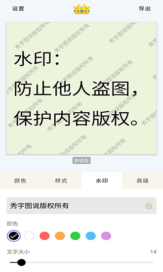 秀字图说轻松把文字转成图片,软件有自定义的功能可以修改颜色字体等生成你想要的图片。拆字功能帮助你排版让图片更好看,以及水印功能打上水印防止盗图。还有该软件支持长达一万字可生成精美的图片便签,欢迎有需要的朋友下载使用!