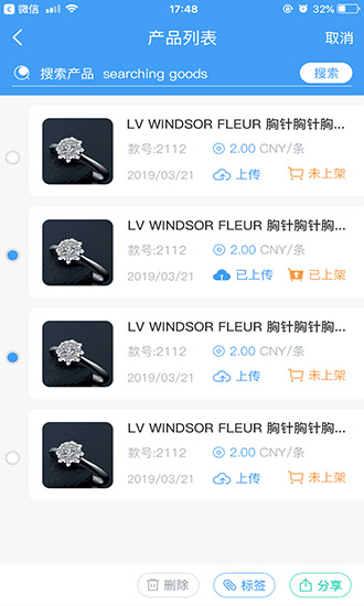 一键分享产品,在产品列表之中能够全选或是选择性的对蟾皮进行朋友圈的分享。