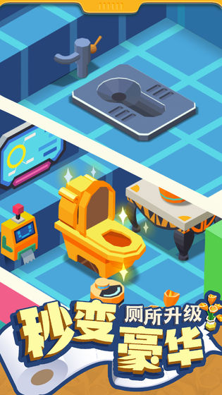 放置类模拟经营手游,建立属于你的厕所帝国,购置配置。不断地进行升级,提升自身的收入,购买豪车和大楼,感受科技时代,白手起家的乐趣。