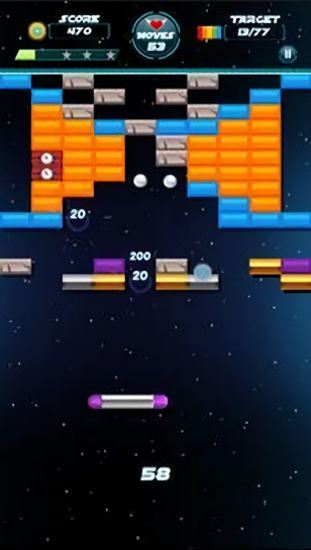 向下滑动手指,向左或向右瞄准,投掷球并击打砖块,每次击打后砖块的耐用性都会降低。