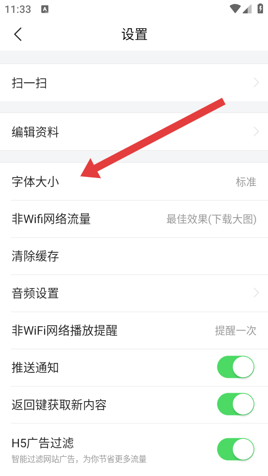 2、在设置页面,点击字体大小的选项,进入字体大小预览界面。