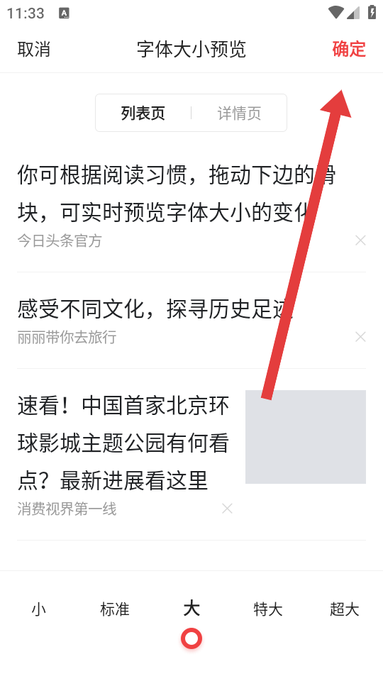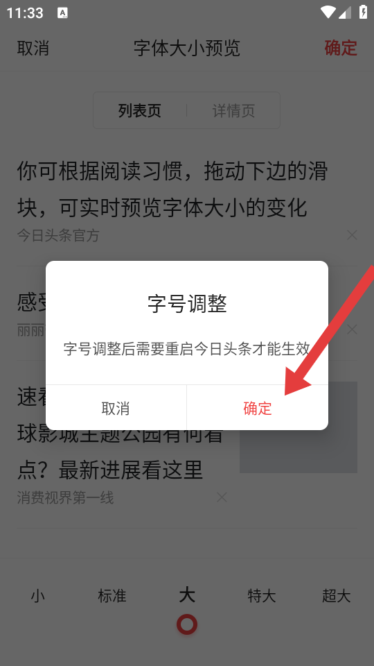 4、在弹出的字号调整确认框中,点击确定的按钮,重启今日头条后字体大小设置生效。