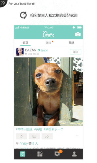 拍它app是一款宠物社交手机软件,这里是一个以宠物为主题充满爱的交友社区!你可以通过软件发你爱宠的萌照,也可以与同样有爱宠的人聊天交流,还能参与好玩的活动和抽奖! 需要的朋友不要错过哦!