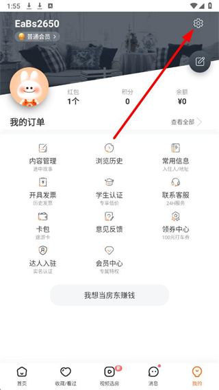 1、打开途家民宿APP后,在我的界面,点击右上角设置按钮,进入设置页面。
