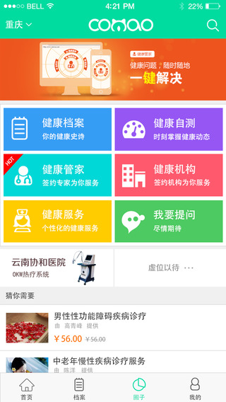 康猫iOS版是一款健康服务应用软件,用户的健康档案都是最真实的,用最真实的数据透视健康状态,量身打造最有价值的健康信息。软件功能非常强大集健康医疗咨询、健康档案、健康服务、健康自测、医院查询、健康社区等众多功能为一体。而且用户可以随时随地掌握并上传自身的健康状况。功能实用便捷,是你身边的健康管家快来下载体验吧!