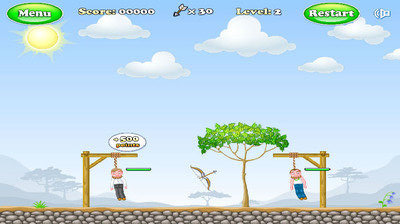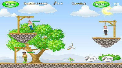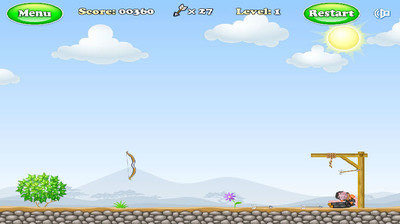 在游戏中,玩家需要根据抛物线规则设计好弓箭的射击方向,准确的击中游戏中的绳索来拯救绞架上的人们,注意,千万别射到人身上,不然救人不成反害人。