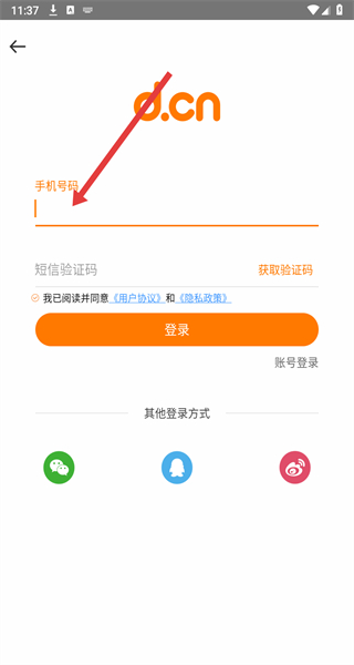 3、跳转到手机号码登录页面中,可以点击输入框填写手机号,用来获取验证码进行登录操作。