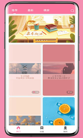 专业壁纸应用,高品质精选壁纸,美化桌面、锁屏。壁纸君是一款非常实用的手机壁纸软件,软件功能非常强大,里面提供海量的优质壁纸资源,每天实时推送,用户轻松根据分类寻找感兴趣的类型,操作非常简便,能够一键设置为手机桌面、锁屏。