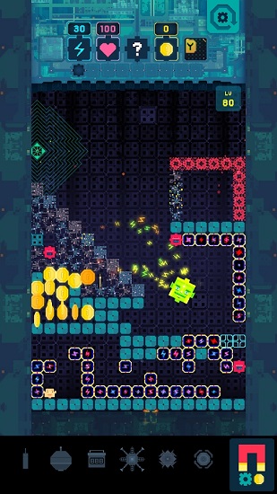 -战略性地使用8种不同类型的炸弹,以清除道路并避免被上升的障碍物淹没。