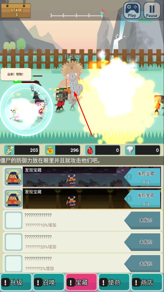 3、到第三阶段,攻击怪物时留意宝藏提示,击败对应怪物获取宝藏,解锁新功能,助力后续关卡战斗 。
