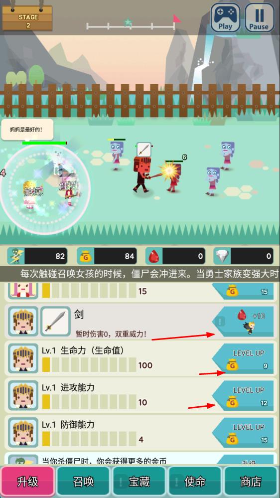 2、推进至第二阶段,点击角色对应属性升级按钮,消耗金币强化生命力、进攻等能力,增强队伍实力 。